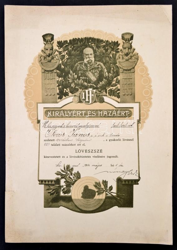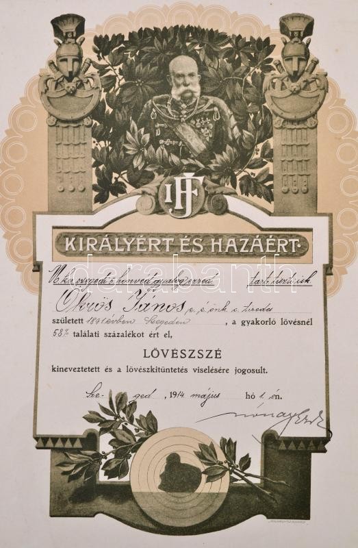 1914 Lövész kitüntetés viselésére jogosító litografált oklevél / Shoot... https://www.darabanth.com/de/27-Gross-Auktion/27.1/Andere-Sammelgebiete/Militar~10704/1914-Lovesz-kituntetes-viselesere-jogosito-litografalt-oklevel-Shooter-lithographic-warr~II1583483