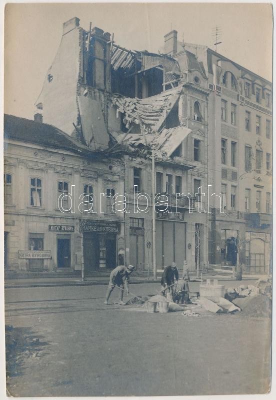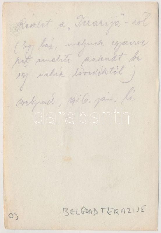 1916 Terazije, Belgrád, szétlőtt ház, fotó, hátulján feliratozva, 13,5×9 cm / 1916 Terazije, Belgrad, a bombed house, photograph, with notes on the back, 135,×9 cm
