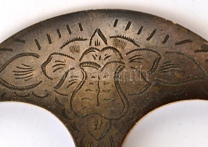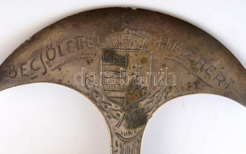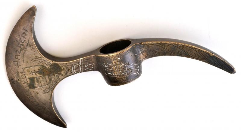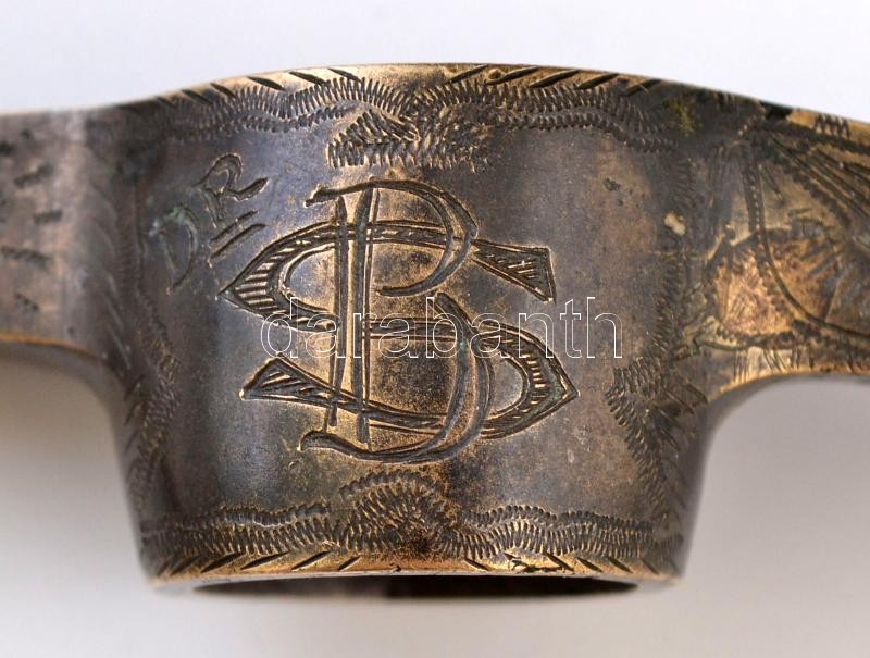 Beschreibung: 1943-1944 "Becsülettel a hazáért / Szerbia 1943-44 / Dr. B. S. (S. B.?)" feliratú, gazdagon díszített réz fokos, koronás magyar kiscímerrel, h: 14 cm