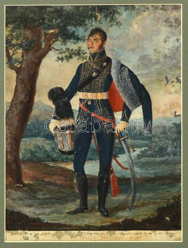 cca 1808 Balta Miklós (?-?) későbbi százados huszáregyenruhában, akvarell, papír, német nyelvű felirattal, paszpartuban, üvegezett díszes fa keretben, 28,5×21 cm / cca 1808 Nicolaus von Balta (?-?) in k. k. Hussar uniform, watercolour, on paper, with notes in German, in passepartout, in a glassed wooden frame, 28,5×21 cm