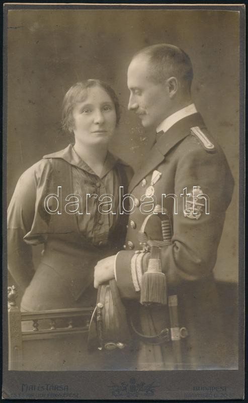 cca 1910 Osztrák-magyar tengerész tiszt és felesége műtermi keményhátú fotója, Mai és Társa műterméből, 20,5x13 cm / cca 1910 Austro-Hungarian Navy officer, photo, 20,5x13 cm