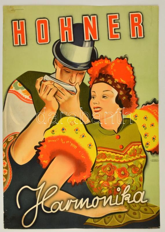 cca 1935 Hohner harmonika reklám plakát, színes litográfia. Hauptmann grafika, Klösz nyomda, f.k. Greiner A., gyűrődésekkel, kis szakadással, 70x49 cm / Hohner harmonica advertisement poster, lithography, 70x49 cm