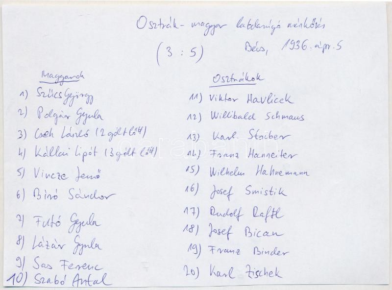 1936 Az osztrák és magyar válogatott tagjainak (Szűcs György, Kállai Lipót, Willibald Schmaus, Franz Hanreiter, stb.) aláírásai a magyar csapatot ábrázoló fotó hátulján, R. Werian bécsi műterméből, 13×18 cm
