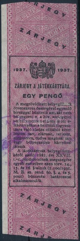 Beschreibung: 1937 1P kártyajegy, kártya-zárjegy (Hodobay 33a.) / 1p card tax-stamp