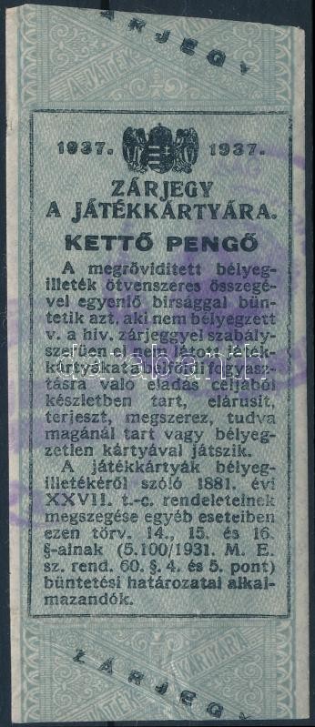Beschreibung: 1937 2P kártyajegy, kártya-zárjegy (Hodobay 34.) / 2p card tax-stamp