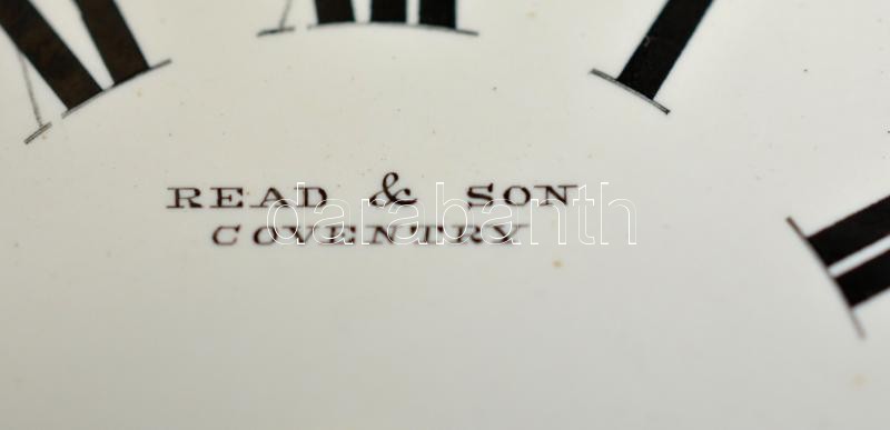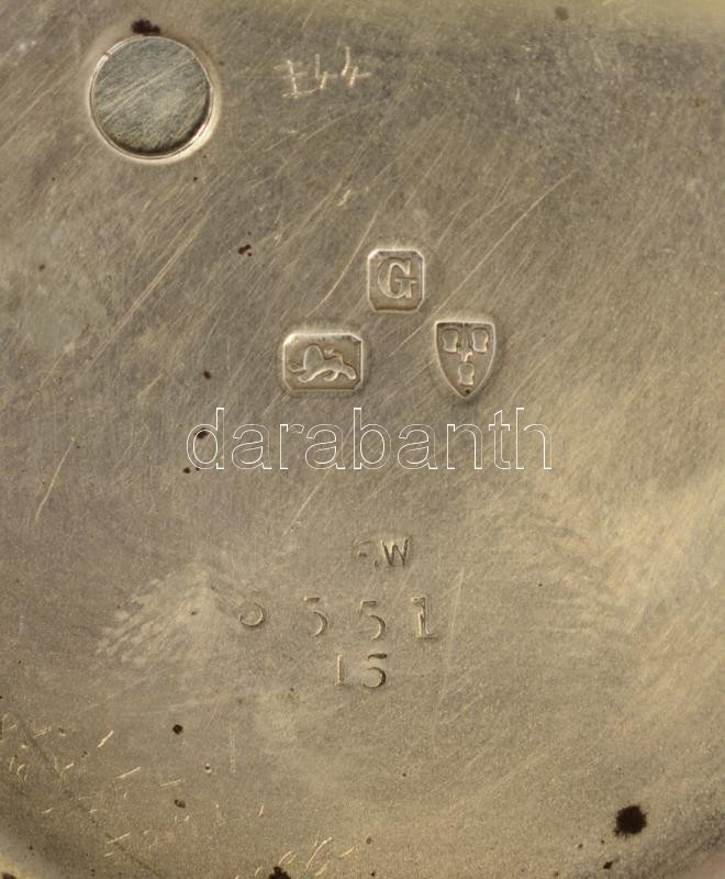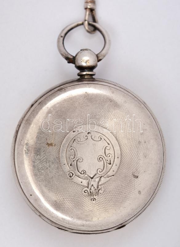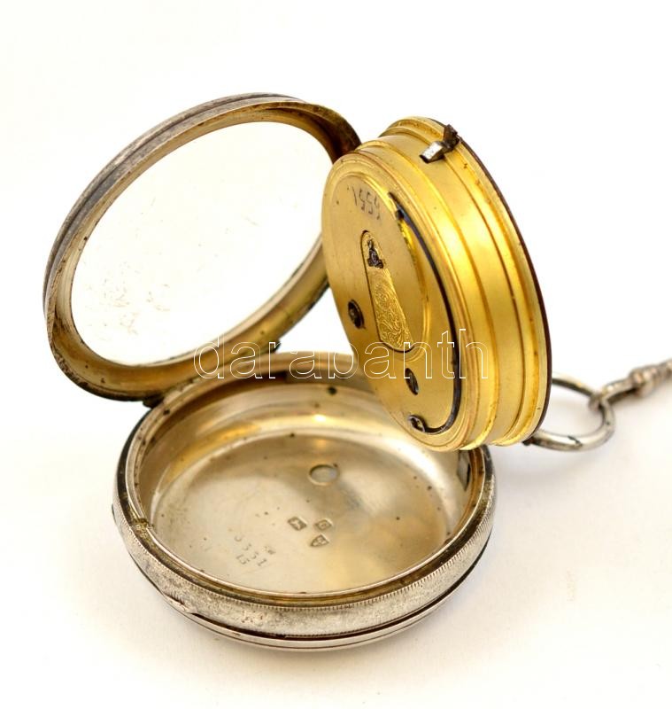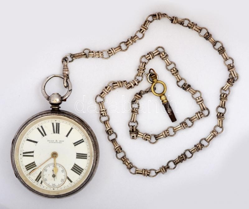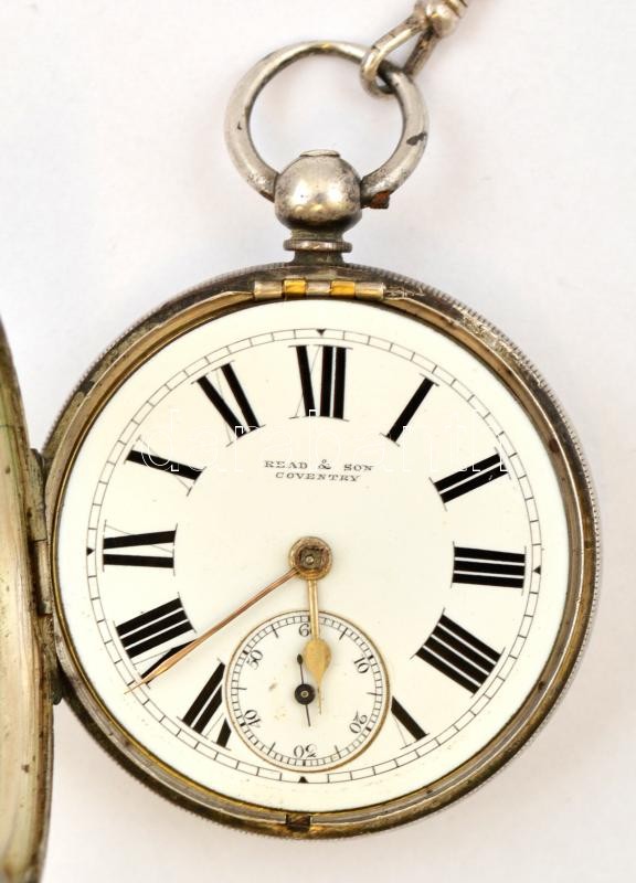 cca 1890 Read & Son, Coventry jelzett zsebóra. Kulcsos, háromfelé nyitható, hibátlan számlappal, szépen járó, működő szerkezettel,. kulccsal, ezüst óralánccal / cca 1880 Signed silver pocket watch. With winding key. Works well. With silver chain. d:5,5 cm 156 g