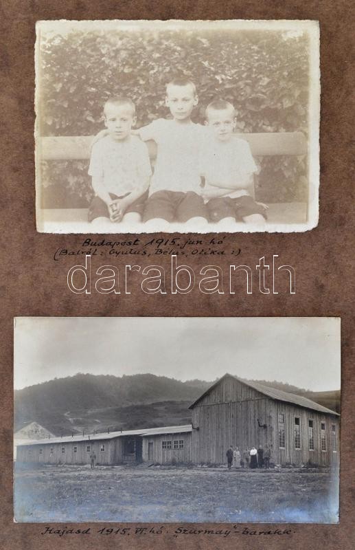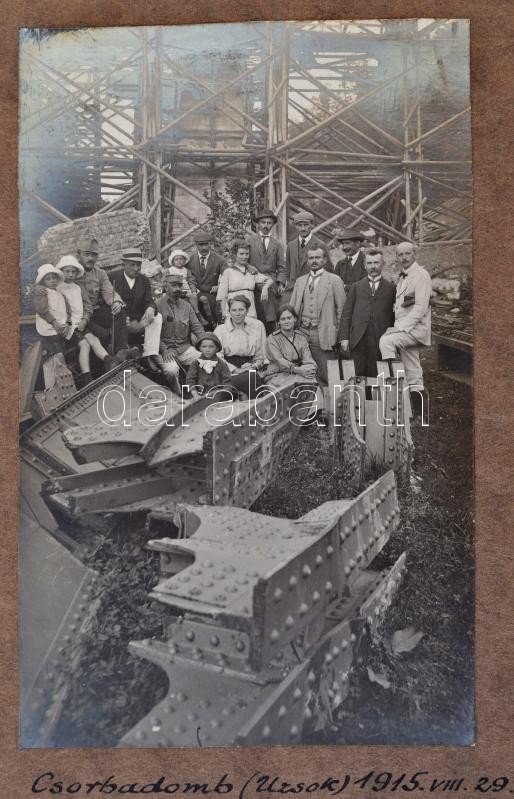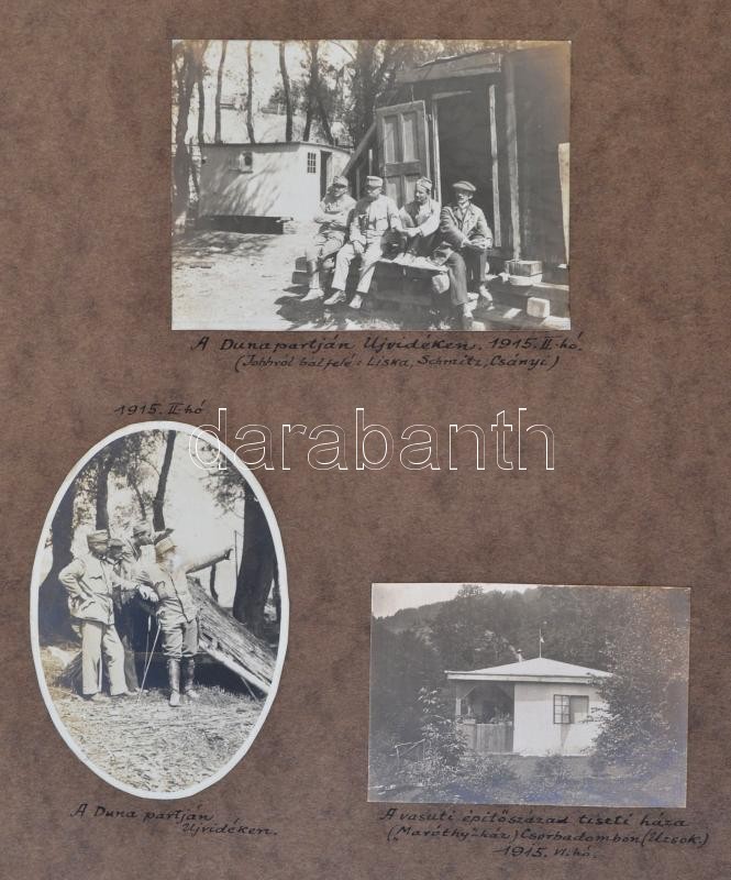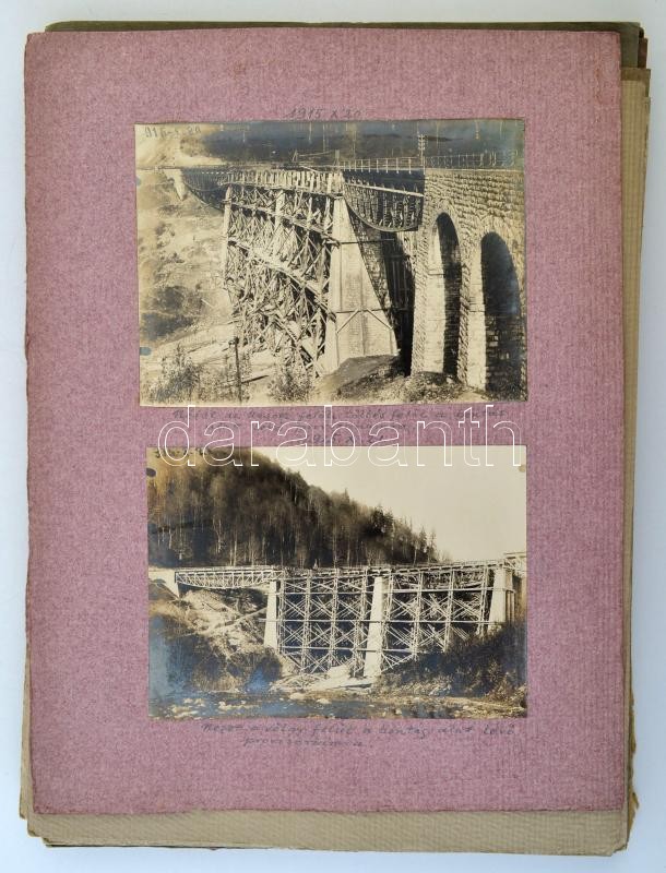 1915 A kárpátaljai Csorbadombi vasúti híd építkezése. A magyar vasúti mérnökök által készített látványos fotóalbum. 64 db részletesen feliratozott fotó külön táblákon. Közepes és nagyobb méretben. Érdekes anyag. / 1915 Building of the Csrobadomb / Cserbin railway bridge in Carpatho Ukraine. 64 photos with detailed descriptions.