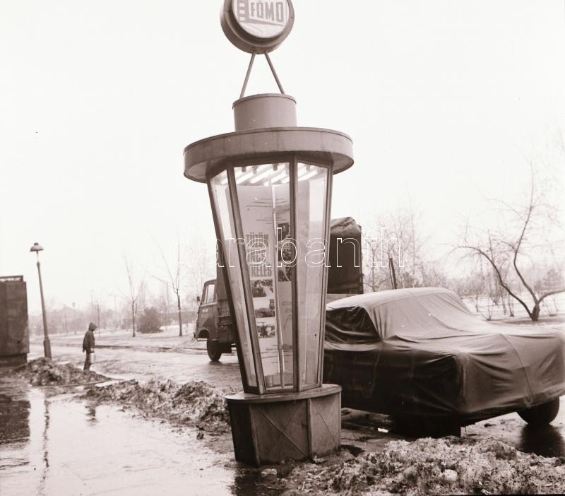 Beschreibung: 1969 Budapest, a Fővárosi Moziüzemi Vállalat hirdető oszlopai, plakáthelyei, kirakatai, ahol az új filmeket hirdették, 13 db szabadon felhasználható, vintage negatív, 6x6 cm