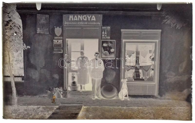 cca 1935 Hangya vegyesbolt és a tulajdonosok valahol Bács-Kiskun megyében, 1 db szabadon felhasználható vintage üveglemez negatív, Lőcsei Árpád (?-?) kecskeméti vándorfényképész hagyatékából, 8x13 cm