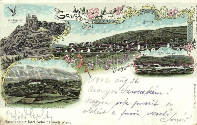 Beschreibung: Avtovac, Kordonposten Gat., K.u.K. Militärlager, Cordons-Caserne Cemerno. Kunstanstalt Karl Schwidernoch / castle, military barracks, floral, litho (fa)