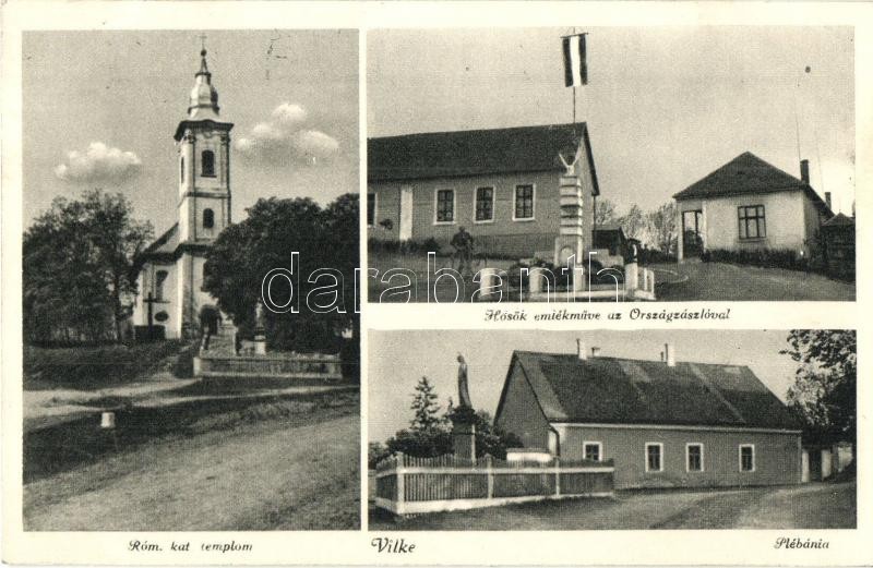 Vilke, Velká nad Iplom; Római katolikus templom és plébánia, Hősök emlékműve az országzászlóval / Roman Catholic church and parish, heroes monument with Hungarian flag