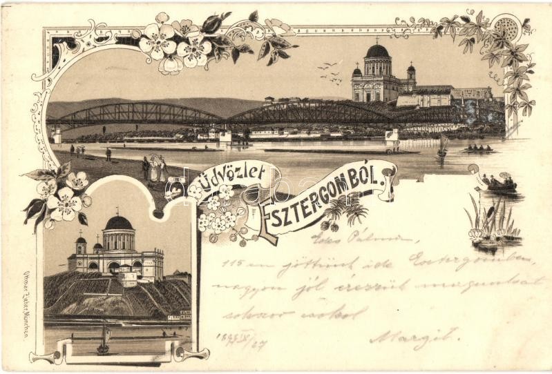 Beschreibung: 1897 (Vorläufer!) Esztergom, Bazilika, híd, Ottmar Zieher floral, litho