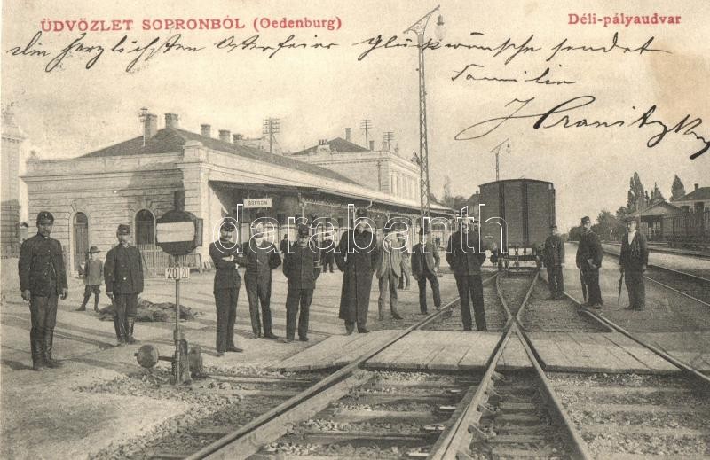 Sopron, Oedenburg; Déli pályaudvar, részlet a vágányokkal, vasutasok c... https://www.darabanth.com/de/27-Gross-Auktion/27.1/Ansichtskarten/Ungarn~10794/Sopron-Oedenburg-Deli-palyaudvar-reszlet-a-vaganyokkal-vasutasok-csoportkepe~II1575035