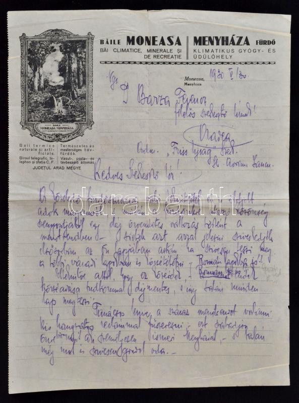 Beschreibung: 1930 Levél Menyháza Fürdő rajzos fejléces papíron, 29x22cm