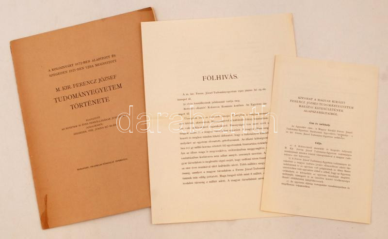 1922 A Kolozsvárt 1872-ben alapított és Szegeden 1921-ben ujra megnyitott M. Kir. Ferenc József Tudományegyetem története. Bp., 1922. Franklin. 20p. Hozzá: Főlhívás a M. Kir. Ferencz-József Tudományegyetem Barátai Egyesülethez csatlakozásról, jelentkezési ív és alapszabály.
