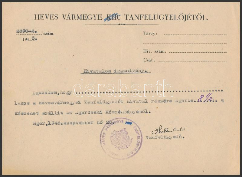 1945. szeptember 20. keltezésű Hivatalos igazolvány. Heves Vármegye Ta... https://www.darabanth.com/de/270-Fernauktion/270.0/Andere-Sammelgebiete/Drucksachen~4/1945-szeptember-20-keltezesu-Hivatalos-igazolvany-Heves-Varmegye-Tanfelugyeloi-Hivatal-igaz~II1360901
