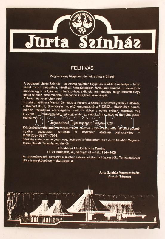 1988 Mentsük meg a Jurta színházat! plakát feltekerve 41x28cm https://www.darabanth.com/de/270-Fernauktion/270.0/Andere-Sammelgebiete/Drucksachen~4/1988-Mentsuk-meg-a-Jurta-szinhazat-plakat-feltekerve-41x28cm~II1366373