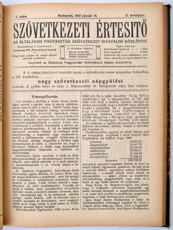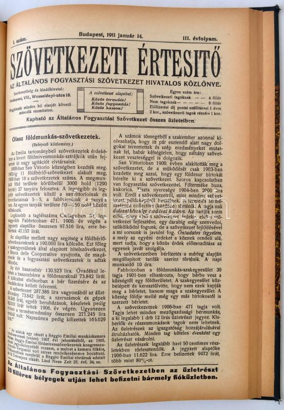 Peidl Gyula (szerk.): Szövetkezeti Értesítő. Az Általános Fogyasztási Szövetkezet hivatalos közlönye. I-III. évfolyam. (I. 1-11. szám (nem teljes), II. 1-12. szám, III. 1-12. szám). Budapest, 1909-1910-1911, Általános Fogyasztási Szövetkezet. Könyvkötői félvászon kötés, 304 p. A három évfolyam egybekötve. A lapokon néhol ceruzával bejegyzés, aláhúzás. Peidl Gyula (1873-1943) politikus, későbbi miniszterelnök (1919) által szerkesztet folyóirat az 1909-11-es évekből.