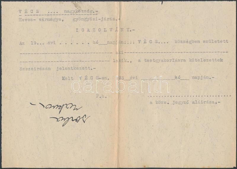 Testgyakorlási kötelezvény, Vécs nagyközségi lakos részére, 1930-as év... https://www.darabanth.com/de/270-Fernauktion/270.0/Andere-Sammelgebiete/Drucksachen~4/Testgyakorlasi-kotelezveny-Vecs-nagykozsegi-lakos-reszere-1930-as-evekbol-Kitoltetlen~II1360856