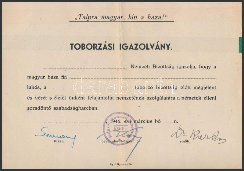 Toborzási igazolvány. Magyar Nemzeti Bizottság - Eger bélyegzővel. Aláírásokkal. A papíron 1945. március hó szerepel, de maga a papír kitöltetlen. Egri Nyomda Rt.
