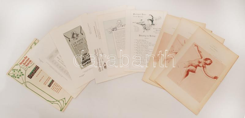 Beschreibung: Vegyes nyomtatvány tétel: cca 1910 7 db különféle német nyelvű szecessziós reklámnyomtatvány, különböző méretben; Le nu féminin, 4 db különféle erotikus nyomtatvány