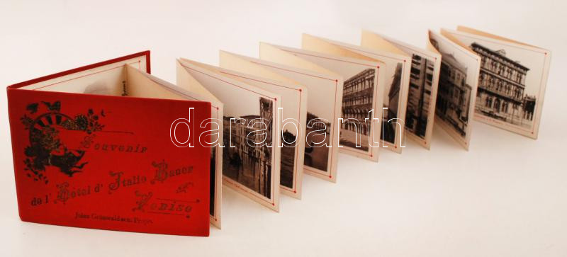 Beschreibung: cca 1900 Souvenir de l'Hôtel d'Italie Bauer en Venise, velencei képes leporelló kiadvány, díszes, aranyozott vászonkötésben, összesen 20 db fényképpel