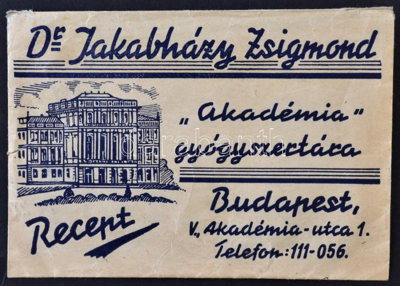 cca 1940 Dr. Jakabházy Zsigmond "Akadémia" gyógyszertára, re... https://www.darabanth.com/de/270-Fernauktion/270.0/Andere-Sammelgebiete/Drucksachen~4/cca-1940-Dr-Jakabhazy-Zsigmond-Akademia-gyogyszertara-receptboritek-8x12cm~II1365448