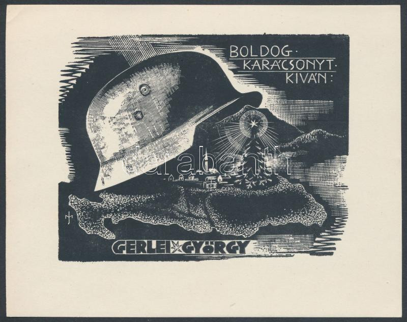 Menyhárt József (1901-1976): Boldog karácsonyt kíván Gerlei György, militária témájú irredenta alkalmi kisgrafika, fametszet, papír, jelzett a dúcon, 8×10 cm