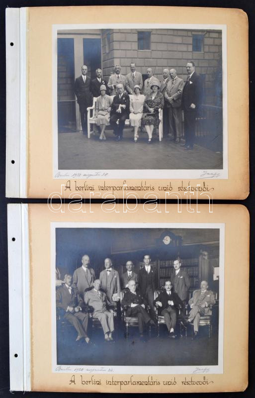 1928-1930 5 db nagyméretű fotó: a berlini interparlamentáris unió résztvevői (4 db), ill. a Tisza István Társaskör vacsorája, feliratozva, kartonra ragasztva, 19×24,5 cm