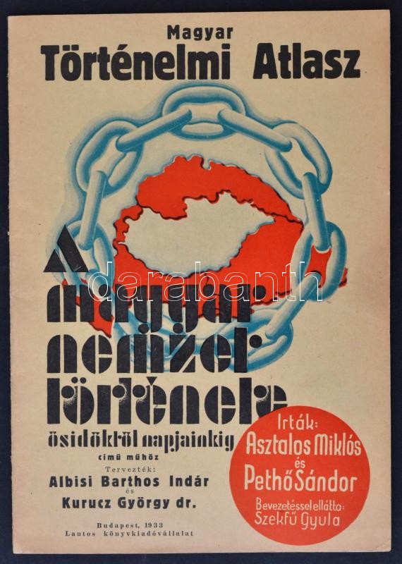 1933 Magyar Történelmi Atlasz. A Magyar nemzet története ősidőktől napjainkig című műhöz. Tervezték: Albisi Barthos Indár és Kurucz György dr. Budapest, 1933, Lantos. Saját kettévált mappában, egyébként szép állapotban.