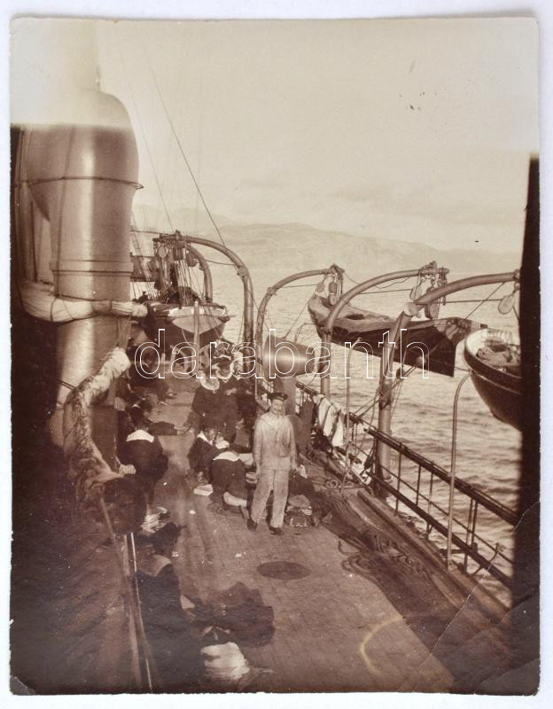 cca 1910-14 A K.u.K. haditengerészet Zenta-osztályú védett cirkálójának fedélzete, felirata alapján az S.M.S .Aspern, azonban a kép középen álló matróz S.M.S. Zenta- feliratú sapkában van, 10x8cm