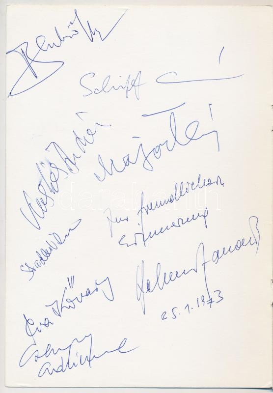 Beschreibung: Prospektus belsejében aláírásokkal: Kőváry Éva, benkő Gyula, Schiff András, stb.