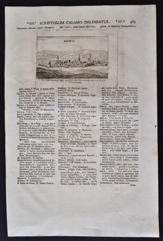 Beschreibung: 1713 Hatvan látképe, rézmetszet, Raffaello Savonarola (?-?) Universus terrarum orbis scriptorum calamo delineatus 1. kötetéből (Padua, 1713), a hátulján Hesdin (Franciaország) rézmetszetes látképével (485-486. p.)