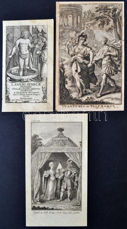 Beschreibung: cca 17-18. század 3 db rézmetszetű könyvillusztráció: L.Annaei Senecae, 1642; Avantures de Telemaque, Regard de belle Dame, 12x7 és 14x9 cm