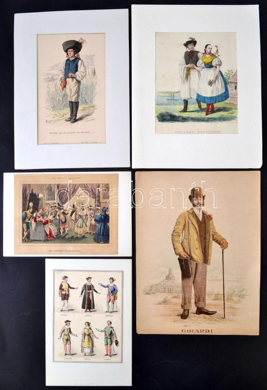 Beschreibung: cca 1880 5 db néprajzi témájú színezett acélmetszet, különböző méretben