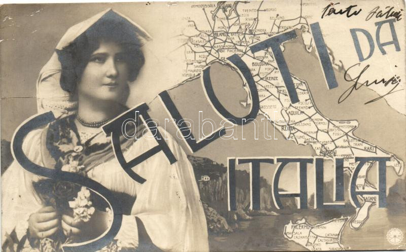 Beschreibung: Saluti da Italia, map of Italy, lady (pinhole)