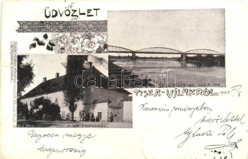 Beschreibung: Tiszaújlak, Vylok; M. kir. sóhivatal, Tisza-híd. Grün Henrik kereskedő kiadása / office building, bridge, floral (r)