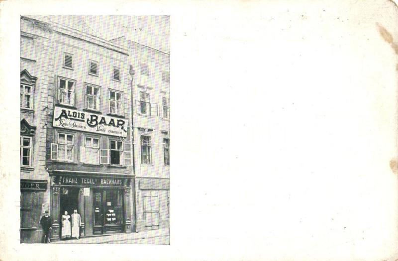 Vienna, Wien I. Innere Stadt, Franz Tegels Backhaus, Alois Baar Kunstschlosserei (Umele zamecnictvi), Max Diamants Geschäft / street with shops (worn edges)