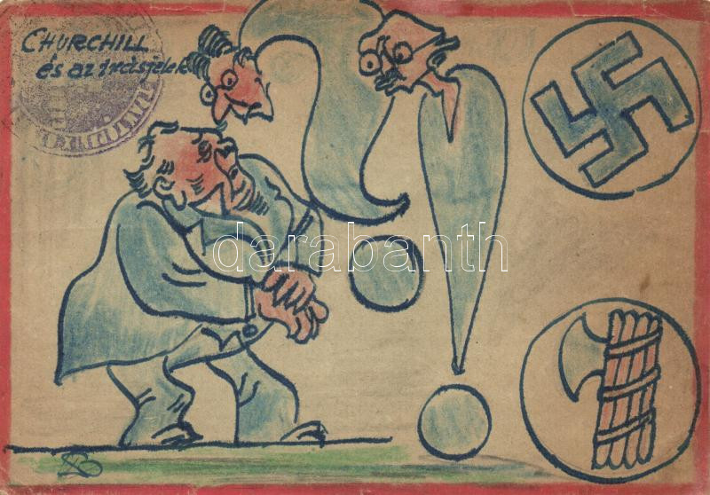 Chruchill és az írásjelek, Második világháborús kézzel készült magyar tábori posta levelezőlap, amerika-ellenes német nemzetszocialista propaganda / WWII hand-made military propaganda, Anti-American NS propaganda (b)
