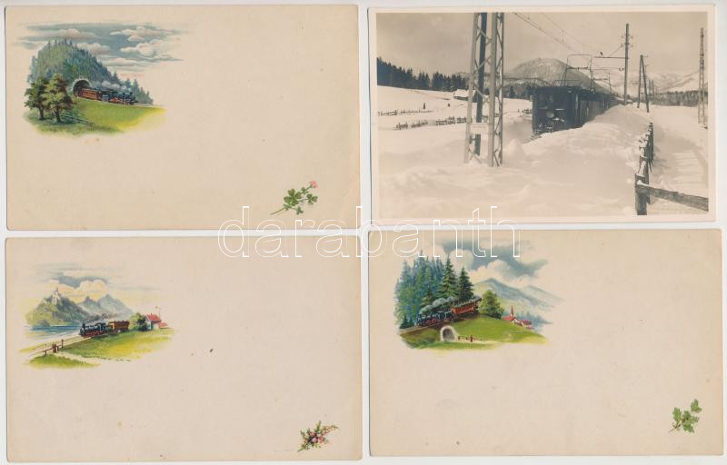 Beschreibung: 4 db vasút témájú motívumlap, vonat / 4 motive cards; trains, litho