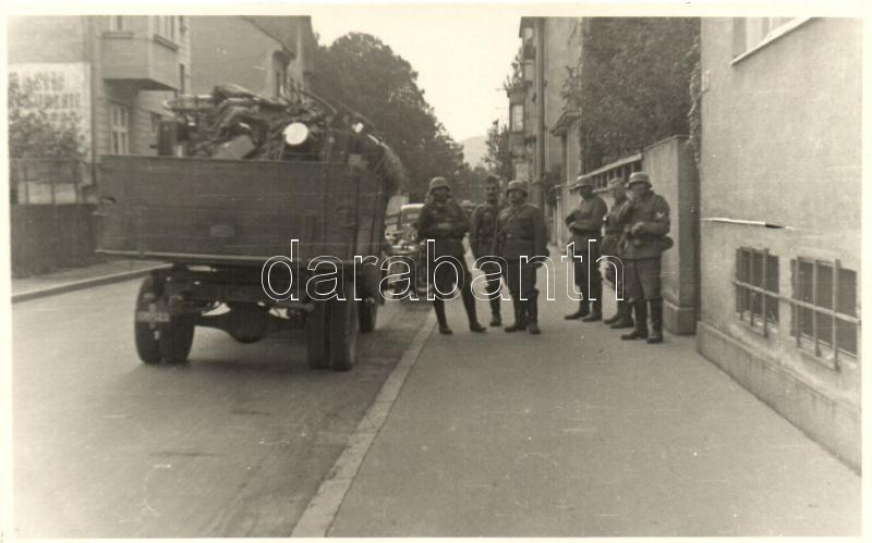 Beschreibung: 1939 Zsolna, Zilein, Zilina; katonák teherautóval / soldiers with truck, photo