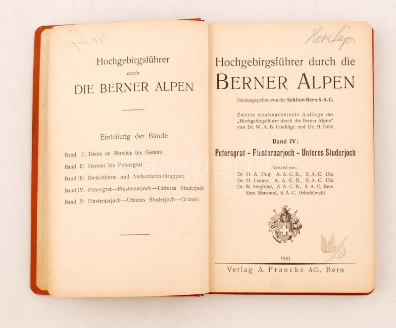 Hochgebirgsführer durch die Berner Alpen IV.: Petersgrat - Finsteraarjoch - Unteres Studerjoch. Bern, 1931, Verlag A. Francke AG. Átnézeti térképekkel. Kicsit kopott vászonkötésben, jó állapotban.