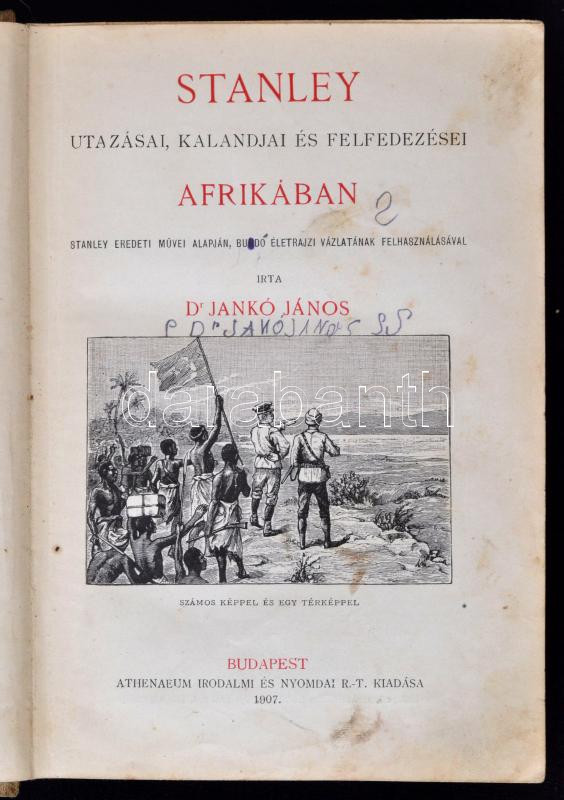 Dr. Jankó János: Stanley utazásai, kalandjai és felfedezései Afrikában. Számos képpel. Budapest, 1907, Athenaeum Irodalmi és Nyomdai R.T. Kiadói egészvászon borító, 281 p. A borítója foltos, maszatos. A könyvben pár helyen firka. Az elülső védőlapon, és a hátsó előzéklapon tulajdonosi névbejegyzés. Pár lap foltos.