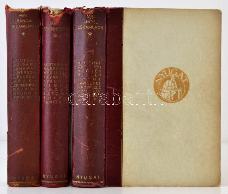 3 db. Mai Külföldi Dekameron. (japán, angol, francia) Budapest, É.N., Nyugat Kiadás. Kiadói félbőr kötés, 261+303+285 p. A gerincek viseltesek, kopottak, sérültek.