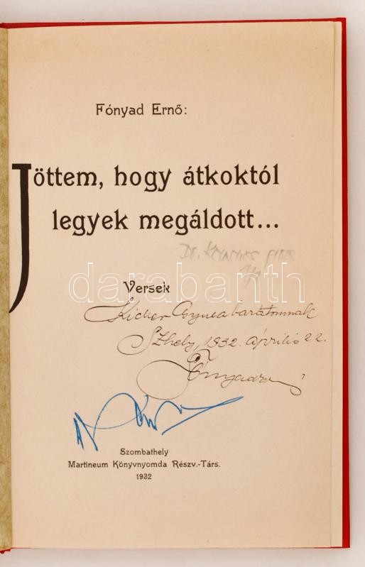 Fónyad Ernő: Jöttem, hogy átkoktól legyek megáldott... Versek. Szombathely, 1932, Martineum Könyvnyomda R.T. Egészvászon, 80 p. A szerző által dedikált példány!
