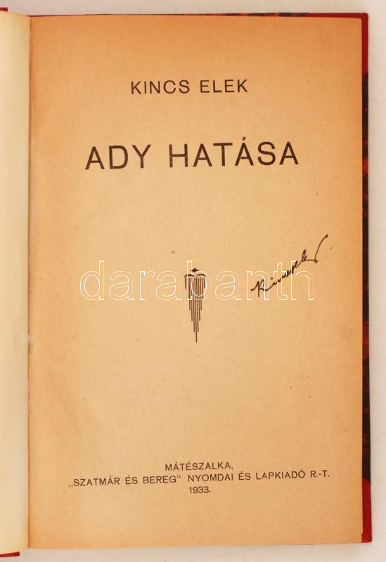 Kincs Elek: Ady hatása. Mátészalka, 1933, "Szatmár és Bereg"... https://www.darabanth.com/de/270-Fernauktion/270.0/Bucher/Bucher-Sonstige-Raritaten~43/Kincs-Elek-Ady-hatasa-Mateszalka-1933-Szatmar-es-Bereg-Nyomdai-es-Lapkiado-RT-Atkot~II1367272