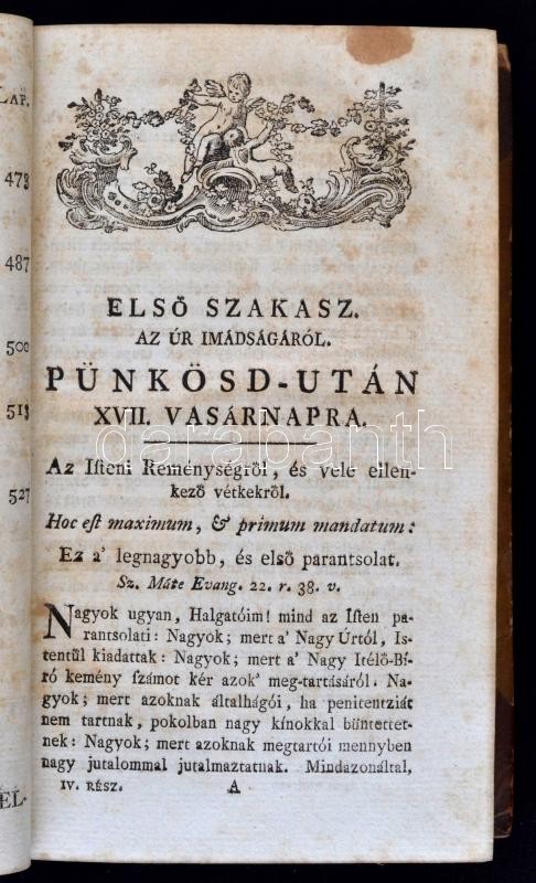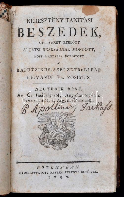 Ligvándi Fr. Zosimus: Keresztény-tanítási beszédek, mellyeket ezelőtt a' pétsi deákságnak mondott, most magyarra fordított a' kaputzinus-szerzetbéli pap Ligvándi Fr. Zosimus. Negyedik rész. Az Úr Imádságáról, anyaszentegyház parantsolatiról, és angyali üdvözletről. Po'sonyban, 1797, nyomtattatott Patzkó Ferentz betűivel. Korabeli, aranyozott gerincű, egészbőr kötésben, 8+536+4 p. A címoldalon B. Apollinary Farkafs. beírással. A borítója foltos, kopott. A lapok foltosak. Az elülső védőlap szakadt.