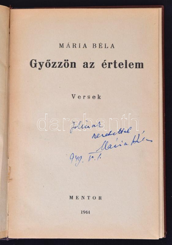 Mária Béla (1903-1975): Győzzön az értelem. Versek. Budapest, 1944, Mentor. Kiadói félvászon kötés, 61 p. 300 számozott példányból a 7. számozott és aláírt példány. A szerző által dedikált! A borítója foltos. A kötése laza.