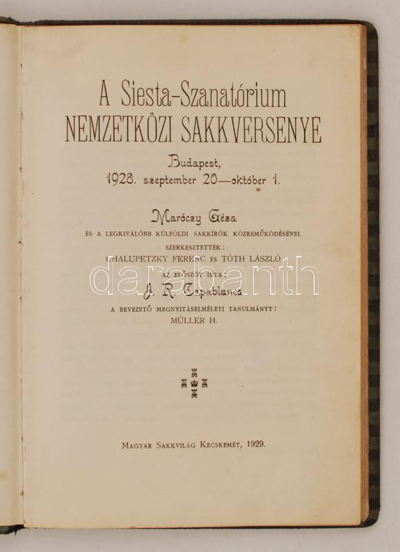 A Siesta-Szanatórum nemzetközi Sakkversenye. Budapest,1928. szeptember 20 - október 1. Maróczy Géza közreműködésével szerk. Chalupetzky Ferenc és Tóth László. Az előszót írta J[osé] R[aul] Capablanca, a bevezető megnyitáselméleti tanulmányt Müller H. Kecskemét, 1929, Magyar Sakkvilág. Foltos egészvászon kötésben