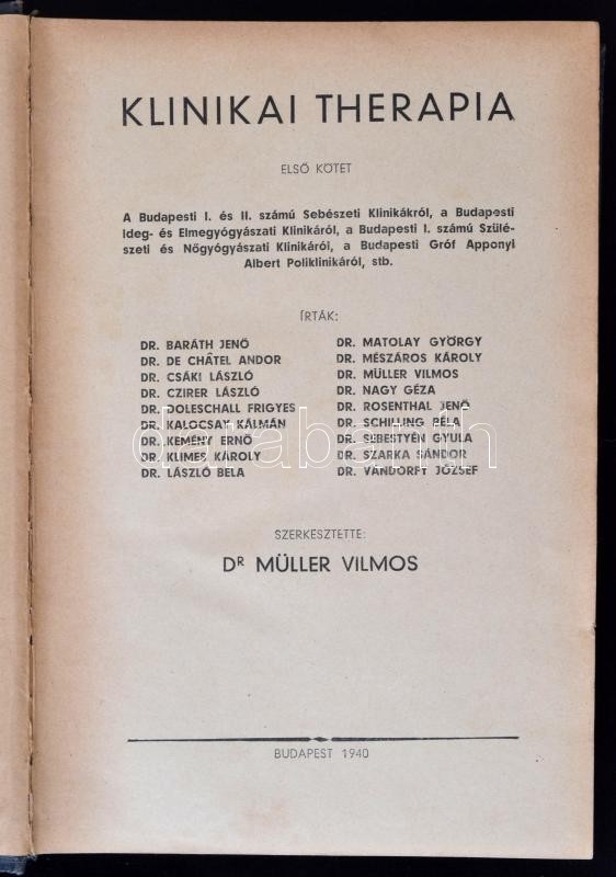 Dr. Müller Vilmos (szerk.): Klinikai Therapia. Budapest, 1940. Kiadói aranyozott egészvászon kötés, 854+865+III p. A könyvben számos fotó és illusztráció található. A borítója kopottas.
